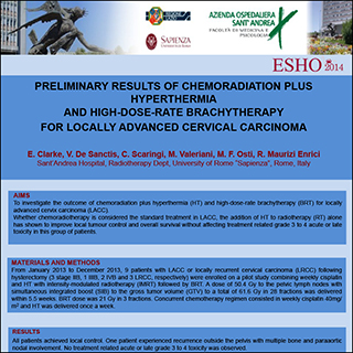2014년, 이탈리아 토리노에서 개최된 유럽온열종양학회(ESHO)에 게재된 학술 포스터입니다. PRELIMINARY RESULTS OF CHEMORADIATION PLUS HYPERTHERMIA AND HIGH-DOSE-RATE BRACHYTHERAPY FOR LOCALLY ADVANCED CERVICAL CARCINOMA 제목으로 게재된 이 포스터에는 국소적으로 진행된 자궁경부암(LACC)에 대한 화학 방사선 + ...